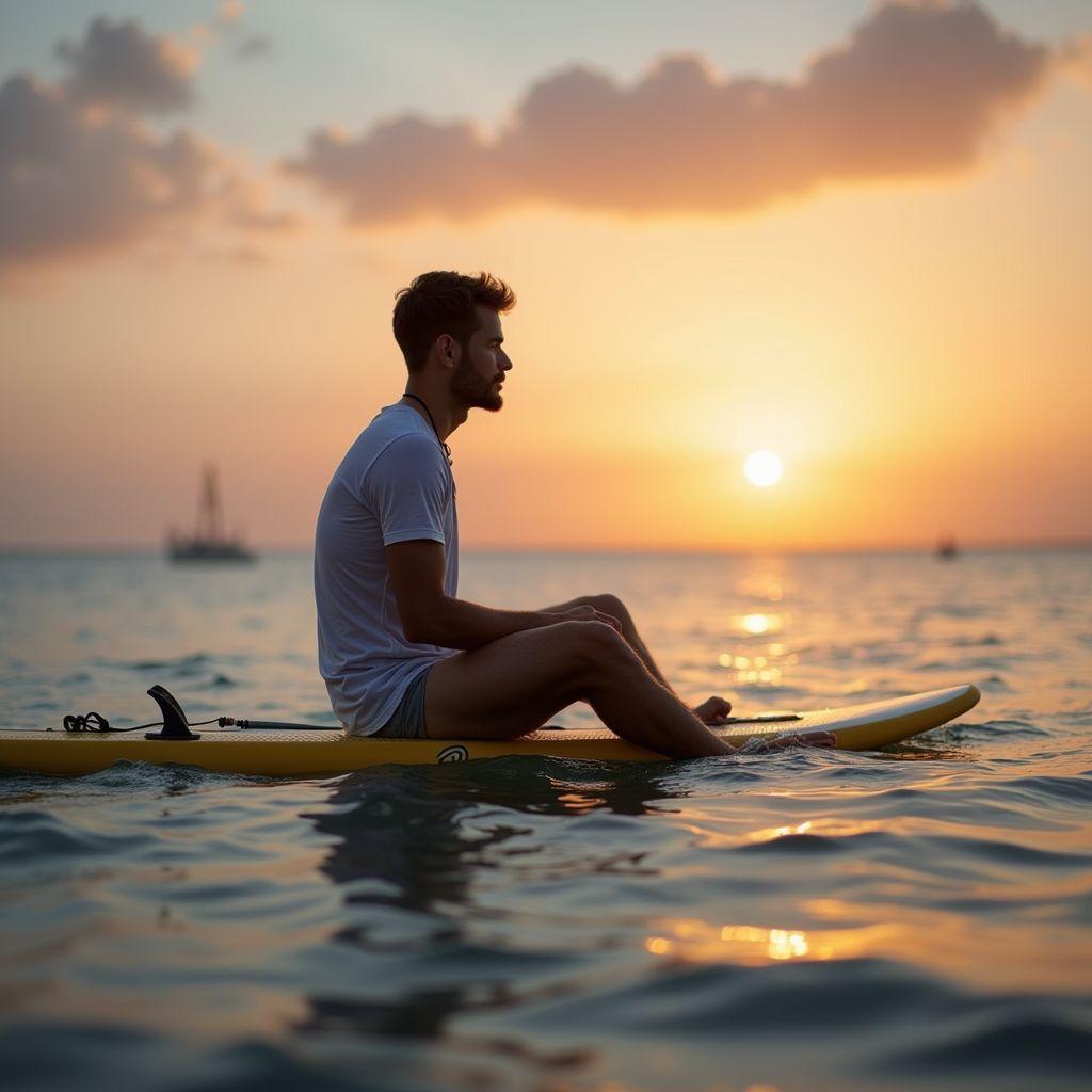 Sitting on a surfboard in the ocean's sunset